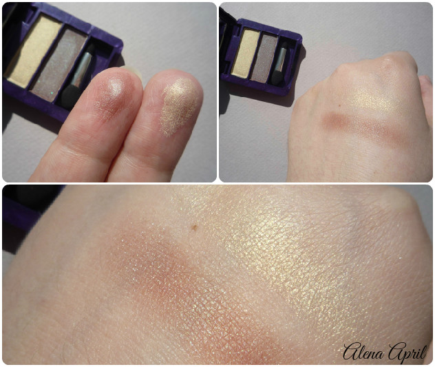 Первый оттенок при спокойном освещении похож на старое золото, такой себе песочный с зеленцой. Второй оттенок похож на нечто фиолетовое с голубым отливом. Моя камера этих "игр оттенков" не передает, потому вам придется поверить мне на слово ;) Одно могу сказать точно - в таком рассмотрении палетка выглядит очень вечерней.